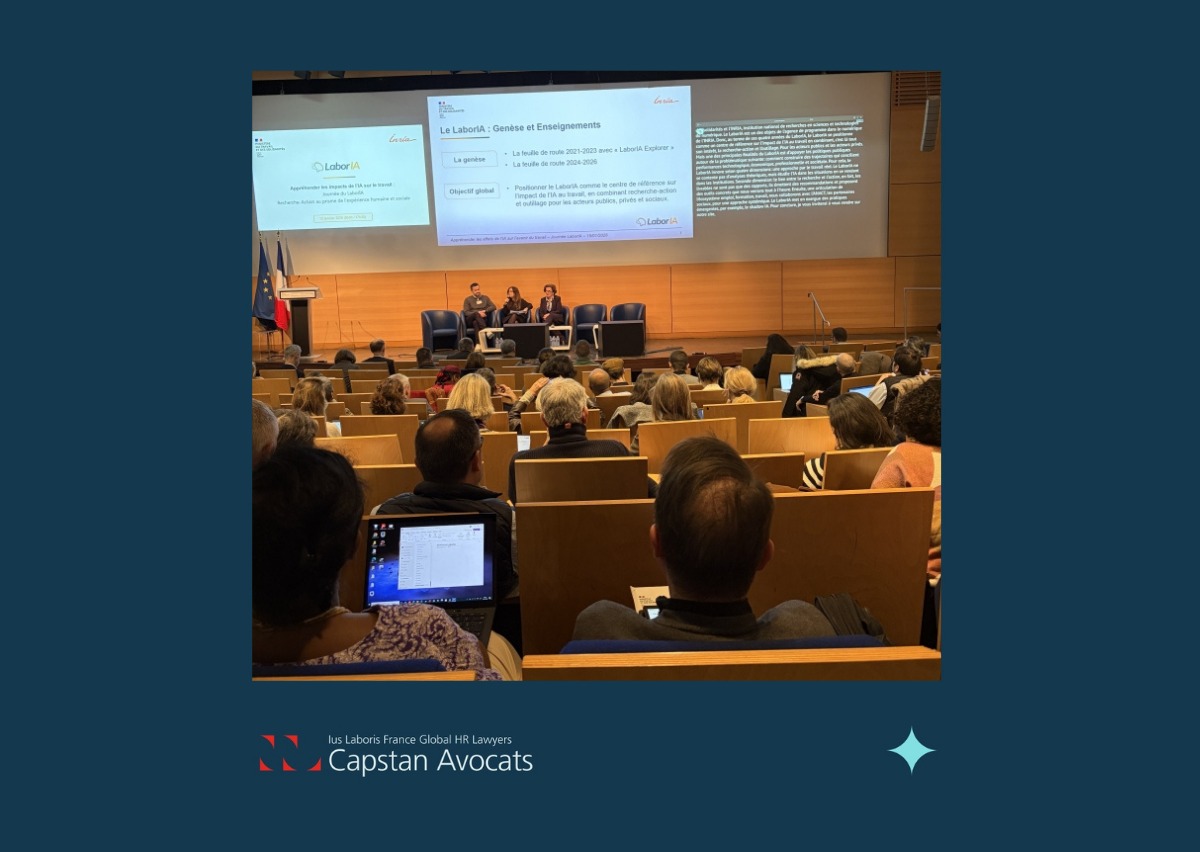 Capstan Avocats a assistĂ© Ă  la JournĂ©e du LaborIA « ApprĂ©hender les impacts de l’IA sur l’avenir du travail », organisĂ©e au ministĂšre du Travail et des SolidaritĂ©s aux cĂŽtĂ©s d’Inria (Institut national...